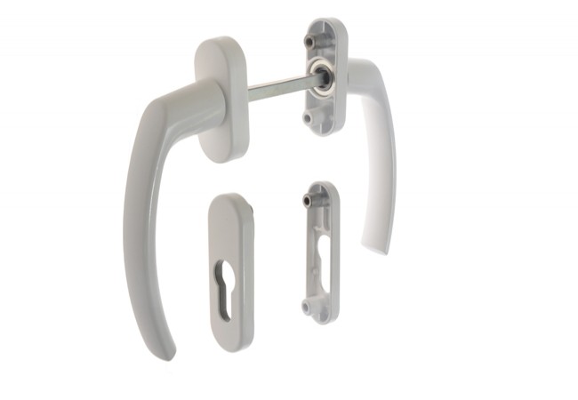 W komplecie 2 różne klamki, trzpień oraz rozety.