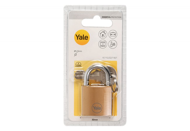 Description - YALE YE11G/32/118/1 gold latching shackle padlock 32mm blister